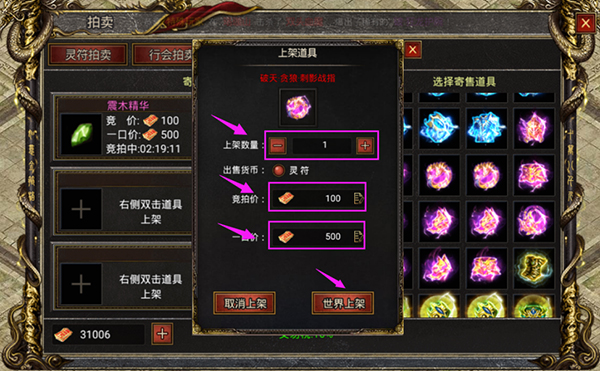 卖家身份:玩家可以将多余或者自己用不到的装备或材料,挂上拍卖行,价格和数量自己定,最后点世界上架就可以了,玩家在拍卖行所获得的灵符,系统会自动收取10%的交易税,若玩家的商品在拍卖行超过4小时,那么玩家的商品会被下架并归还与玩家,若玩家还想要上架就需要自己手动上架了。