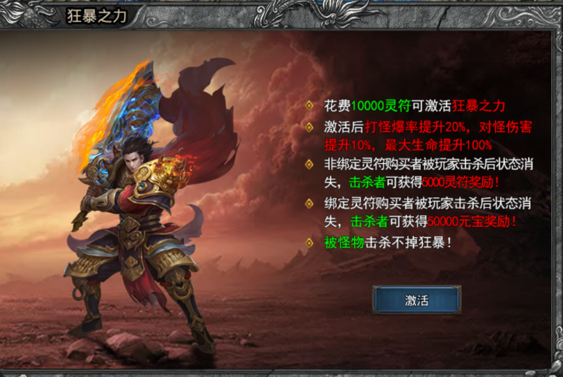 当玩家激活狂暴之力之后,打怪的爆率会提升20%,对怪物造成的伤害提高10%,玩家的最大生命值也会提升10%,当玩家开启狂暴之力之后,若被其他玩家击败,那么狂暴之力的状态就会消失,但是被怪物击败的话狂暴之力的状态不会消失,当玩家开启狂暴之力击败非绑定灵符的玩家时,可以获得5000灵符的奖励,击败绑定灵符的玩家会获得50000元宝的奖励。