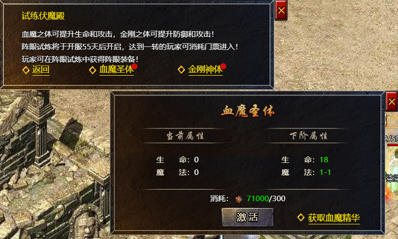 在游戏中,当玩家的达到一定的等级之后,就可以去提升自己的血魔圣体的等级了,这样就可以获得更高的战斗力,玩家可以通过盟重省的NPC“试炼伏魔殿”进入血魔圣体的界面中。