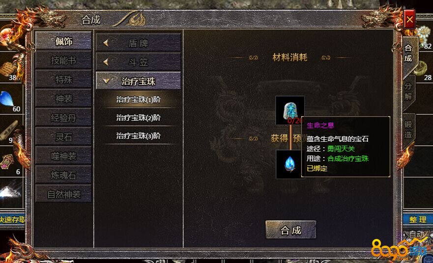 若玩家想要获得生命之息材料的话,就需要通过勇闯天关的玩法获得了,勇闯天关有很大的几率会掉落这些材料,玩家也可以从节日活动和其他活动中获得生命之息材料,当玩家获得大量的生命之息材料之后,就可以进入到配饰的合成界面中,然后找到治疗宝珠的合成操作界面,最后玩家需要消耗20个生命之息,就可以合成1阶的治疗宝珠了,后面的每一阶都需要前一阶的治疗宝珠和相应的生命之息材料,就可以升级了,并且还能获得攻击\魔法\道术、生命、提升药物的恢复效果、自动回复生命\魔法值的属性效果。