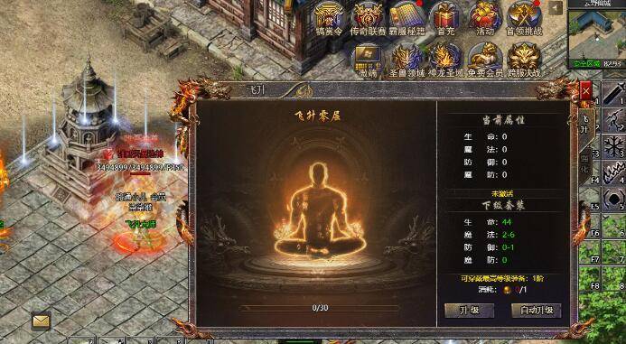 当玩家进入到云野仙城的安全区域内时,就可找到NPC“飞升大师”,并与其对话,打开飞升系统界面,这个界面里有飞升升级界面和飞升装备强化界面两个小界面。在飞升升级界面里,玩家可消耗【修为丹】的材料,去提升自身的飞升等级。飞升共有30层,每层升级需要不同数量的【修为丹】,层数越高消耗的【修为丹】越多。