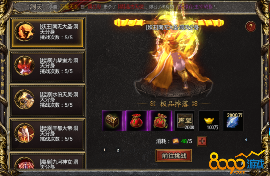 南无大圣:需要消耗洞天通牒5个才能进入,击败之后可以获得:1级洞天奖励箱、1级随机法宝袋、1星随机魔神宝袋。
