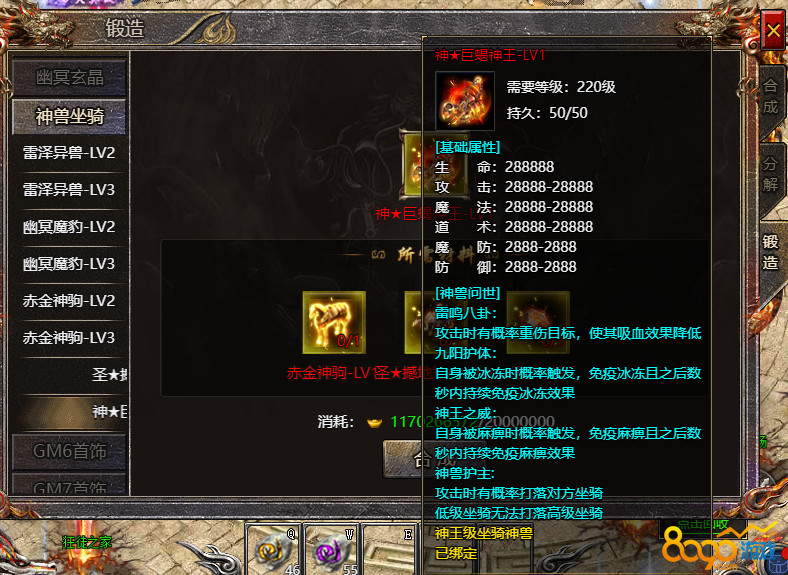 在游戏中,玩家想要开启蝎子需要开服满120天,且在已经合成神牛坐骑的情况下才能开启,蝎子比其他几个宠物要帅气许多,如果之前合成神牛坐骑需要分解出冥豹和雷泽,然后在活动中用水晶兑换一个神驹,一级蝎子需要神驹加上神牛,另外还需三颗坐骑合成石,二级除了需要神驹和神牛,还需要5颗坐骑合成石,三级神驹神牛,还需要十颗坐骑合成石。