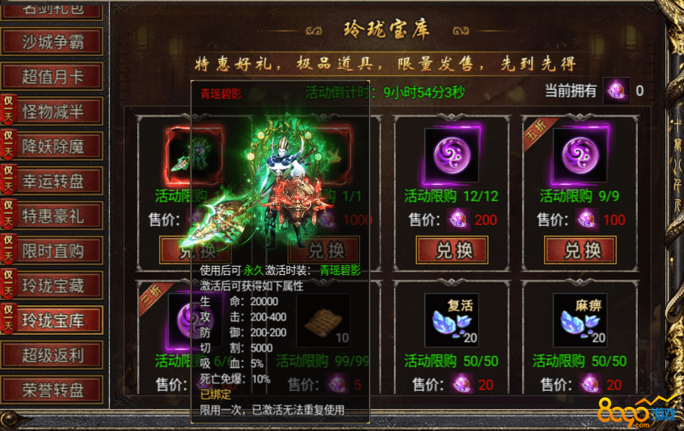 在游戏中,玲珑盛宴需要玩家消耗玲珑秘宝才能兑换,这次的玲珑盛宴有3个稀有的,2个返厂的,第一个是时装,叫“鹰眼剑豪”,需要3000玲珑秘宝才能兑换,鹰眼剑豪可以给玩家带来大量的属性,例如:生命加30000,攻击加600,防御加600,切割加8000,吸血加5%,死亡免爆加10%,这个时装带来的吸血和死亡免爆属性还是蛮好的。