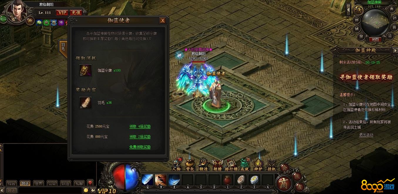 在游戏中,伽蓝神殿是一个十分有特色的活动,玩家可以在活动中击败BOSS,获得令牌,玩家可以通过掉落获得的令牌去兑换大量的珍惜材料,这些材料可以帮助玩家提升角色的战斗能力,玩家在开服满14天及以上的时候就可以参与活动了,活动开启时间为每周的周一、周三、周五,玩家获得令牌之后可以在神殿中央的安全去内,寻找伽蓝使者,然后使用令牌兑换材料,在活动中失败后,是会掉落装备的。