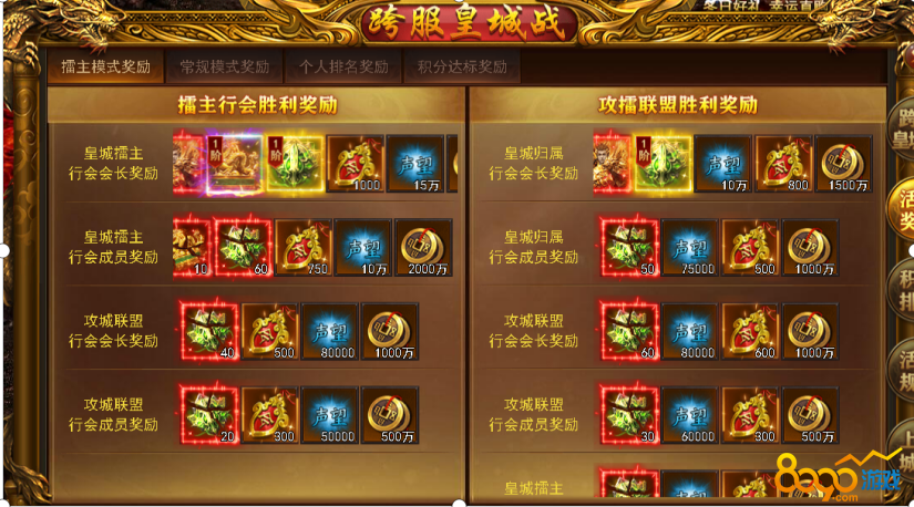 擂主模式玩法:被选为擂主的行会可以直接进入到皇宫内,不需要攻打皇城雕像,其他的行会会变成攻城联盟,联盟行会需要击败皇城雕像之后,才能进入到皇宫中,联盟行会不能相互攻击,需要联手击败擂主行会,若当前皇宫内剩余的都是擂主行会的成员,那么擂主行会临时占领皇宫,反之则是联盟成员占领,当活动结束之后,最终占领的是擂主行会的话就会被视为擂主行会胜利,反之则是联盟行会中获得积分最高的行会胜利。