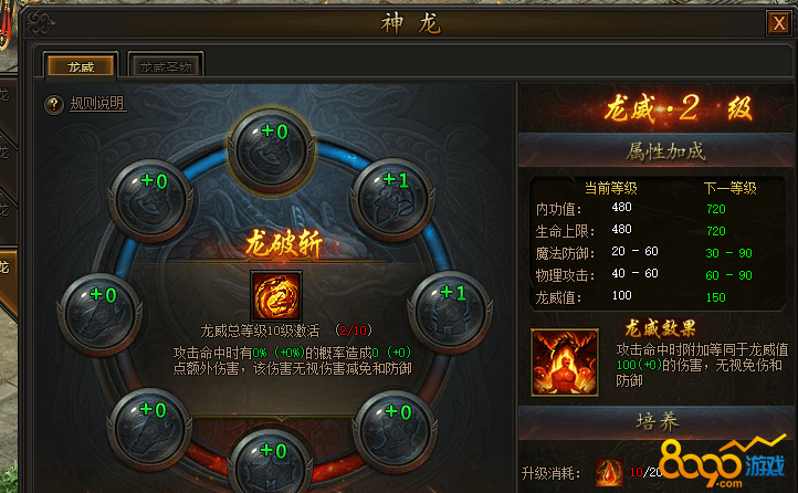 搜索"8090网页游戏"传奇霸业是一款比较经典的三职业传奇类游戏,玩家众多,游戏活动丰富,玩法多样,受到广大玩家们的喜爱,今天就和大家讲解一下传奇霸业的龙威升级属性吧。