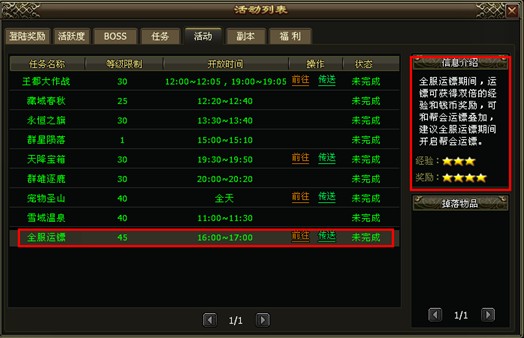 每天下午16:00~17:00是全服运镖活动的时间,在这个时间内运镖有双倍的经验和钱币奖励!一个小时内运5次,路途又不远,时间充裕的很!