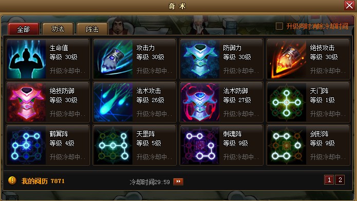 奇术是很重要的一个实力增长点,升级奇术需要的时间虽然不长,但是需要升级的奇术却很多,功法如果可以尽量全部升级,阵法可以选择。