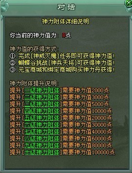 傲视遮天新推出了一个神力系统,可能还有很多玩家不知道,获得神力值后可以在神兵天将NPC处提升神力等级从而获得神力附体状态。