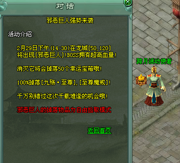 话说傲视遮天的玩家们,我们来说说这个最新的活动啊。 傲视遮天跨越活动你参与了么?今天邪恶巨人强势来袭你知道么?2月29号14:30系统准时在龙城刷邪恶巨人boss,之前至尊魔王只掉至尊魔戒,这个boss超级富有,有50个宝箱和1把九殇至尊,一个自尊魔戒,奖励是双倍的,而且,最让人兴奋的是自由捡取,即使你没有参与打怪,即使你的攻击没有别人高,只要你够幸运,装备也许就是你的了。