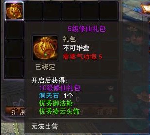 玩家创建完角色进入游戏即可获得总价值达1888元的修仙礼包一个。随着玩家等级提高,玩家可以开出包含更多奖品的更高级礼包。
