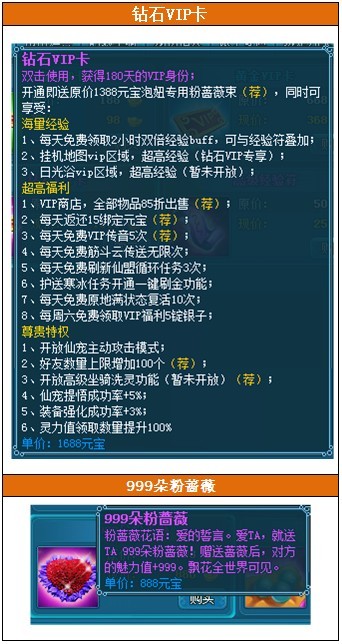 活动内容:玩家首次购买使用钻石VIP卡可额外获得【999朵粉蔷薇】,钻石VIP卡原价3288元宝,开服前三天商城限时抢购只需888元宝!予人鲜花,手有余香!