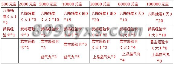 【活动内容】:活动期间,单日累计充值元宝达到指定标准额度,可额外领取对应奖励;若单日累计充值达到100000元宝,可以领取所有奖励的道具!