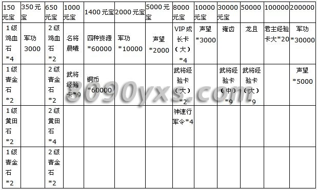 【活动内容】:活动期间,累积充值150,350,650,1000,1400,2000,5000,8000,1000元宝的玩家可获得以下奖励。