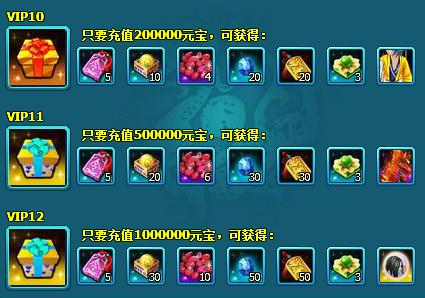 活动内容:玩家通过充值元宝可以提升VIP等级,高级VIP能够继承低级VIP的所有特权。