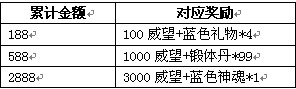 活动时间内,玩家累储储值以下金额,就赠送对应超值回礼,累积越高,奖励越多。