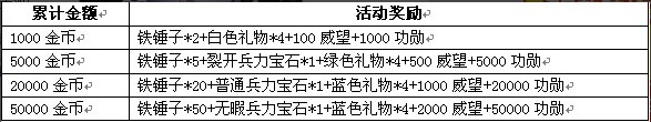 活动时间内,玩家单笔储值以下金额,就赠送金币回礼,储的越高,回馈越高。