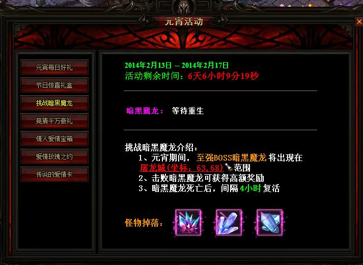 活动期间,屠龙城外(坐标区域:待定)刷出1只暗黑魔龙和3只血天使,玩家击败暗黑魔龙后,魔龙将掉落大量奖励(暗黑魔龙被击杀后,间隔4小时会重新刷出)。