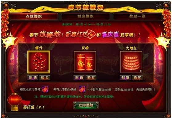 活动期间,玩家可点击界面左侧“新春鞭炮”进入活动面板,元宵放鞭炮,好运滚滚来!