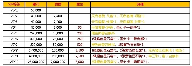 6、提升等级达到40级:500000银币、四级天启令*20、一级资质药剂*30、铭文卡片*5。