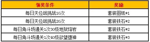 套装材料从哪里来?待我告诉你。活动期间,每日参与天位战,角斗场通关指定次数即可获得奖励。