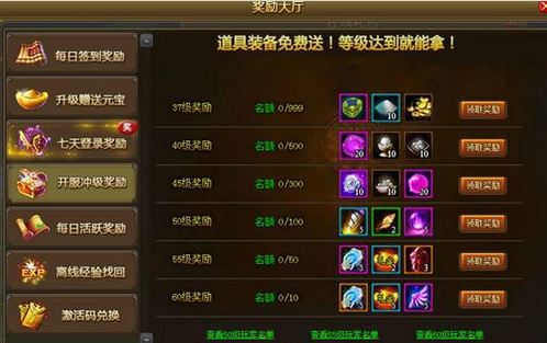 活动期间,所有玩家只要达到足够等级的需求,可在 开服活动 中领取大量道具。
