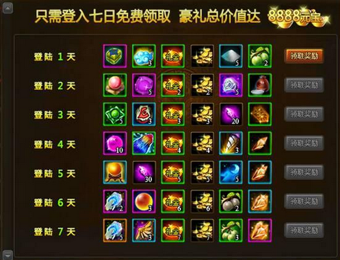 活动期间,所有玩家只要 坚持每日登陆,可在 奖励大厅处,连续七天可以领取总价值8888元宝每日登陆礼包。
