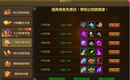 活动期间,所有玩家只要达到足够等级的需求,可在 开服活动 中领取大量道具。