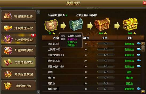 活跃度30:孔雀石*3,洗炼石*3,20礼金*1