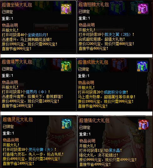 活动说明:新区特惠礼包,限时限量抢购,商城将会出现各种优惠礼包,手快有手慢无哦!快来抢购吧!