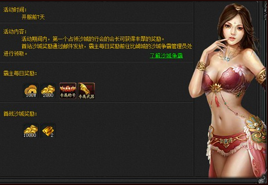 活动说明:新区开服后第一次城争霸赛获得胜利的王族会长都能获得额外的元宝奖励