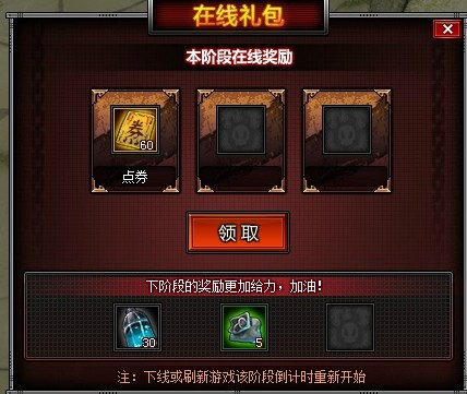 活动内容:从建立角色起玩家保持在线相应时间即可获得额外奖励,其中包括礼券和珍贵的体力哦~