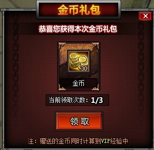 活动内容:从建立角色起玩家前三日登陆游戏,每天即可领取30金奖励,且该金币算做VIP经验