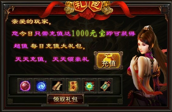 注:每个角色每天充值达1000元宝可领取(使用最高充值比例充值只需10块钱)