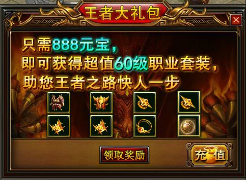 礼包内容:王者大礼包(888元宝):三职业60级职业套装(战神、堕落、乾坤)+50级服装+战魂珠(中)