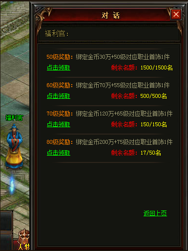 活动内容:只要在领奖名额满员之前,升级到50、60、70、80级即可到烈焰城“福利官”NPC处,领取新区冲级奖励(注:免费领取,名额有限,不可错过哦)