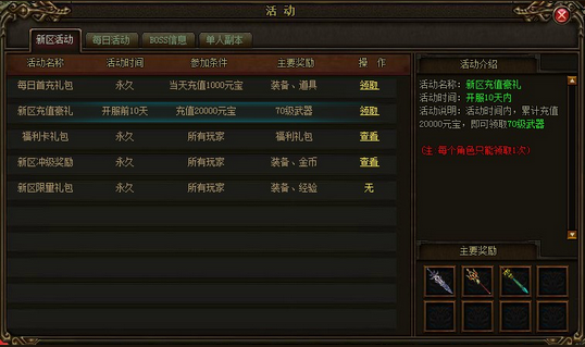 活动说明:只要累计充值达2万元宝,即可领取70级职业武器一把(白虎战剑、火灵法杖、青龙道剑)(注:每个角色只能领取一次,重复领取无效)