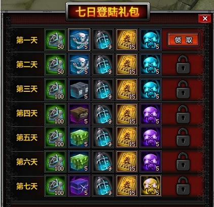 活动内容:从建立角色起玩家前7日登陆游戏,每天都可领取额外奖励。