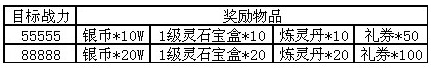 活动内容:活动截止日期24点整战力排行前5名玩家将获得战力礼包一份,同时活动期间内达到目标战力即可获得目标战力礼包