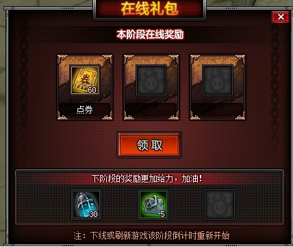 活动内容:从建立角色起玩家保持在线相应时间即可获得额外奖励,其中包括礼券和珍贵的体力哦~