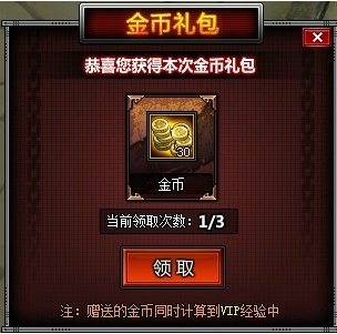 活动内容:从建立角色起玩家前三日登陆游戏,每天即可领取30金奖励,且该金币算做VIP经验
