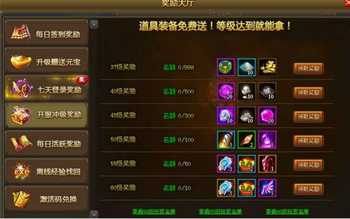 活动期间,所有玩家只要达到足够等级的需求,可在 开服活动 中领取大量道具。