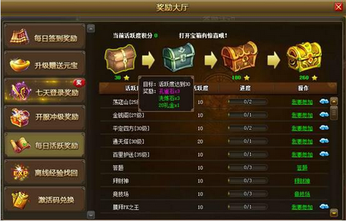 活跃度30:孔雀石*3,洗炼石*3,20礼金*1