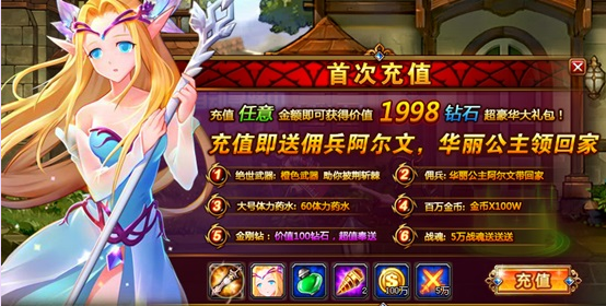 首充礼包:20级橙色武器×1、阿尔纹公主·佣兵卡×1、大瓶体力药剂×1、金刚钻×2、战魂×50000、金币×1000000;