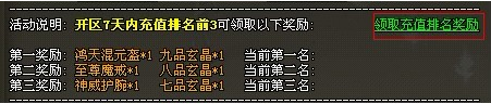 【活动内容】开服7天内,累计充值排名前3的玩家,活动结束后即可额外获得丰厚的奖励。