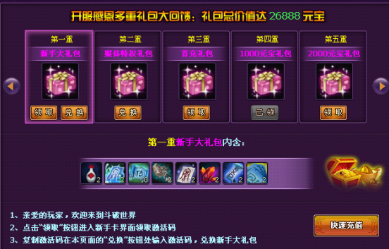 3、复制激活码在本页面的“兑换”按钮处输入激活码,兑换【新手大礼包】。如下图