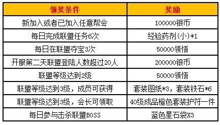 每周二,六联盟战开启,联盟达到2级即可参与,参与联盟战满足以下条件即可获得奖励。