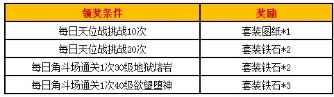套装材料从哪里来?待我告诉你。活动期间,每日参与天位战,角斗场通关指定次数即可获得奖励。