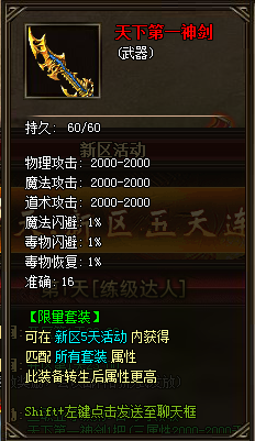 活动内容:逐日传说新篇章,开服首日冲级速度大比拼,只要在开服首日结束时等级达到全服第一,就能立刻获得逆天武器——天下第一神剑!